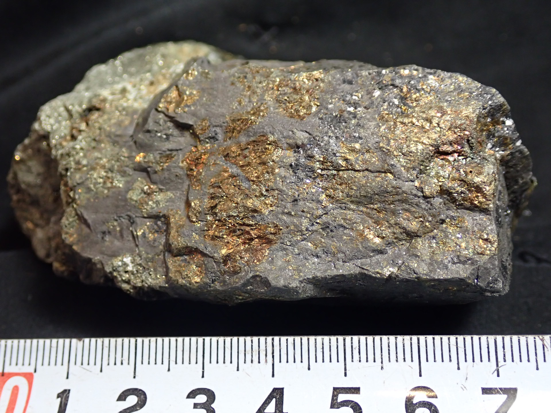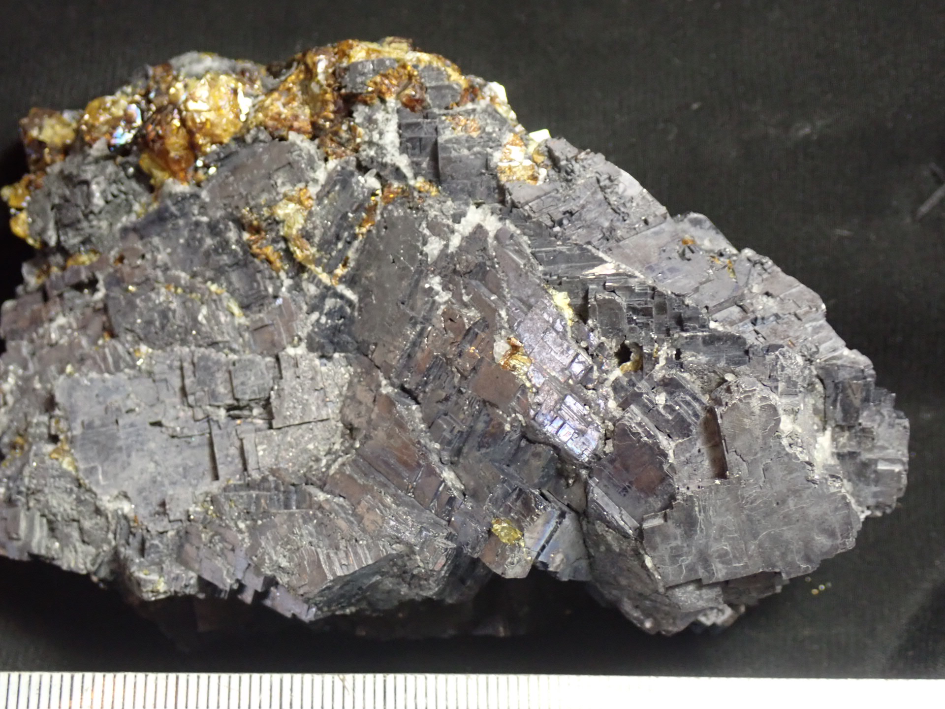 尾去沢鉱山では、s30年代後半には約500条あった既存鉱脈の枯渇により対象鉱種を銅鉱に絞っており、s38年には鉛鉱の採掘を終了し、本鉱山産の方鉛鉱の鉱石標本は意外に少ないようである。さて終活で尾去沢産方鉛鉱の在庫を整理していると、黒い方鉛鉱(一枚目写真)が混じっており(今まで気にもしていなかったが・・・)、よく調べると方鉛鉱の劈開面に黄銅鉱がメッキ状に付いている(二~三枚目)。今回はこの事象に関して、手元在庫標本を色々調べた結果(素人の勝手な推測だが・・・)を述べよう。
