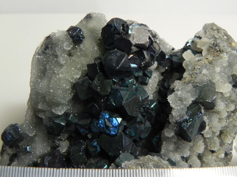 普通の方鉛鉱は、皆サンご存じの如く鉛灰色で明瞭な劈開面を持ち、肉眼で容易に区別が出来る硫化鉱物の一つである。この例外として尾去沢鉱山からは、明治時代に「ハリス鉱」と呼ばれたデュルレ鉱(Cu31S16)化した方鉛鉱結晶が産出している(第36話を参照)。戦後も方鉛鉱結晶表面が輝銅鉱(Cu2S)化した見事な標本が産出しており、方鉛鉱結晶が晶出後に銅成分を含んだ熱水鉱液による変質を受ける鉱化作用があったと推定される。即ち、即ち酸性熱水により方鉛鉱の硫酸鉛鉱化が起こるのが一般的で(多数の事例がある)、本鉱山でのみ知られる鉛の二次鉱物生成を伴わない方鉛鉱のハリス鉱化(銅鉱化)は、かなり特異な現象と思われるのである。